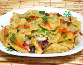 煮滚水,取作法3的南瓜面团,用手边撕捏片状,边捏边下锅。 煮至浮起盛捞起。