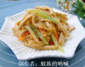 胡萝卜洗净后去皮切丝;炸豆腐干也用水冲洗一下,去掉些油腻,切丝;莴笋切丝。