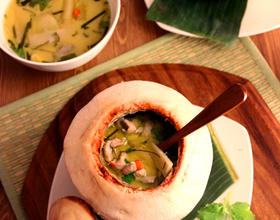 - 2. 锅里加入椰奶和鸡汤煮滚,然后放入柠檬草, 姜,南姜, 辣椒中火煮10分钟