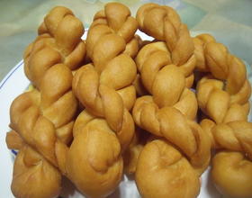 - 4. 再把两端用左手捉住,它会旋转成如图片的样子,再把左手食指放在交叉点的中间,右手将面团向下搓,使它的扭曲更密。