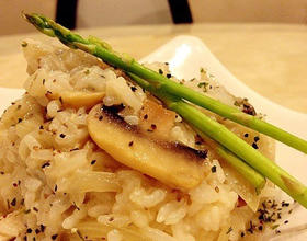 接着放入奶油及蘑菇炒香炒软后,将隔夜饭放入拌炒,用木杓轻压,让白饭粒分明,炒到白饭与食材都溶合一起时,撒上起司粉,盐继续拌炒融合呈黏稠状时,再撒上黑胡椒就可呈盘.