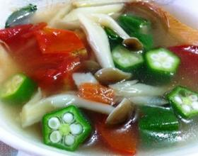 姜片先下锅煮,在下番茄煮约煮10分钟,在下海鲜菇,海鲜菇煮熟后,最后放入秋葵
