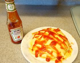 - 8. 完成后,将饭放在蛋皮中间,让蛋皮包住所有的饭,利用一个大盘子将碗内的蛋和饭倒盖在盘中,最后系上番茄酱就大功告成了。