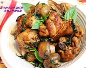 ) 加入酱汁一起烧, 烧至酱汁微微收干, 洒上九层塔叶