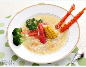 打一颗蛋进去,拌一拌,把蟹脚包装拆开后,盒中有一碗份量的蟹汤,一起倒入浓汤中。