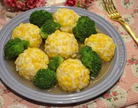 - 3. 鲜玉米刨粒,(也可用市售罐装玉米粒代替,同时必须吸干水分);绿花椰菜洗净切小棵。
