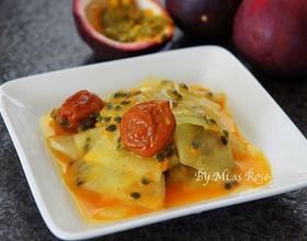 将百香果切开后,取出果汁和果肉,加入砂糖拌匀