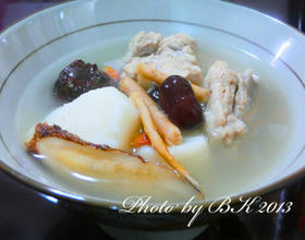 排骨洗净川烫,接着将排骨、山药、人参须、红枣、黑枣及枸杞放入锅中,加入适量水,大火煮开再转小火炖煮至排骨软烂。