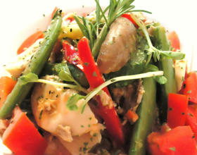 将鲔鱼加入烫煮的青菜中,把所有调味料(迷迭香碎,盐,胡椒,蒜碎)及小豆苗和番茄丁拌均,盛盘完成.