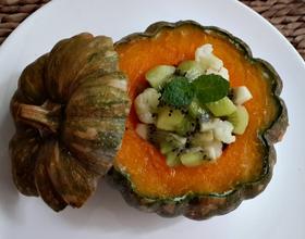 将南瓜梓挖干净, 放入小朵的白花椰菜和奇异果就可以上桌啰~