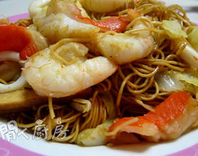 - 7. 将其他配料炒好,再加入虾子面拌匀同炒片刻,最后加海鲜快速兜炒上碟。