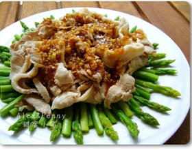 另煮一锅滚水,加入一点盐和油,将芦笋烫至脆绿