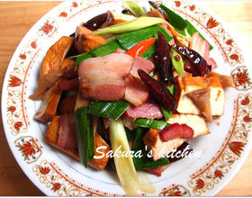 - 4. 腊肉略洗,切片入锅中干煸(小火)片刻捞出.
