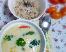 放入蔬菜。将高汤和鸡蛋混合打匀。