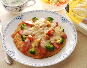 - 5. 在米披萨上摆上绿花椰菜与德国香肠片,于米披萨中间摆上咖哩酱料后,上头均匀洒上起司丝。