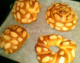 将剩下的牛油和白糖混合,加温溶化拌均后,厚厚地刷在面团上,再撒上杏仁片,放进遇热后的烤箱,烤上下火180度C,15分钟就可。