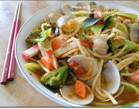 - 5. 【加料】加入小朋友早上的杰作~杏鲍菇、花椰菜、火锅料、红萝卜、蛤蛎,加盖烹煮至熟约2分钟。