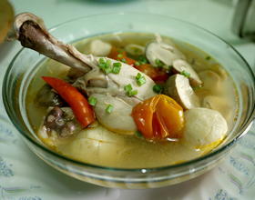 把鸡汤煮热, 加入柠檬草和柠檬叶煮沸。然后加入鸡腿,鱼丸和蘑菇继续烹煮。