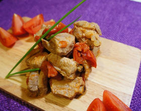 备料:排骨川烫后洗净、三颗番茄切丁(另一颗摆盘用)