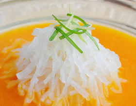 诗心片语:1:萝卜丝用切的,比刨的口感更好,而且越细越好。2:如果没有搅拌机,也可把蒸熟的南瓜趁热用勺子捣成南瓜茸。然后和高汤混合。3:高汤南瓜茸要先煮开再加入蒸好的萝卜丝。而且要用筷子轻轻拨散,而不是用锅铲压开。4:最后一步只要用少许热油泼香葱姜即可,不需要多,不喜欢葱姜的话,可省略此步。