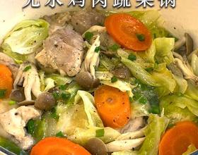 - 4. 放入胡萝卜翻炒均匀,铺上一层包菜,鸡腿肉。