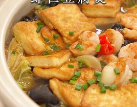 - 7. 锅底放入娃娃菜、蟹味菇、木耳、煎好的豆腐、虾仁、小米椒大蒜片。