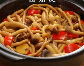 倒入焯过水的蘑菇,翻炒一下,盖盖焖5分钟。