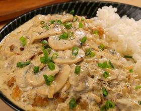 锅中放一块黄油,倒入蒜和洋葱翻炒,再倒入白蘑菇炒软。