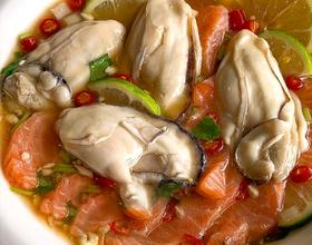 料汁加入三文鱼,生蚝腌制