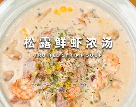 锅中放入洋葱炒香,放入口蘑、培根、大虾断生。