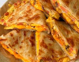 煎至蛋液定型,翻面,手抓饼煎至金黄。
