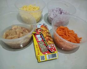 步骤1.先炒熟鸡胸肉。2.洋葱。3.胡萝卜。4.土豆。