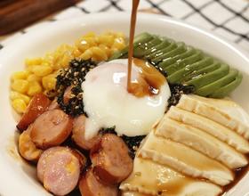 米饭上放上嫩豆腐,牛油果,香肠,玉米粒,海苔碎和温泉蛋。