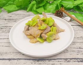 打开锅盖倒入提前腌制好的猪肉片(猪肉片用1克食盐,1勺四季亭有机黑松露酱油,1勺料酒,5克玉米淀粉,5毫升菜籽油抓拌均匀腌制30分钟)