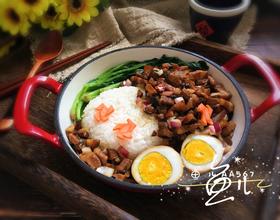 将香菇卤肉收浓汤汁,放洋葱丁炒匀
