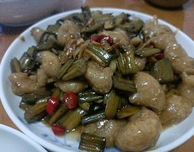 大肠放少许料酒炒,再放入酸芋苗一起煸炒,放蚝油,酱油,勾芡翻炒起锅,不放盐,不然会太咸。