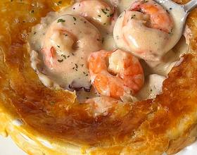 锅中倒油,放入洋葱,口蘑,虾仁,培根炒香。