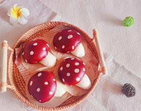 取一个红色面皮用吸管戳几个小孔叠在白色面皮上,包上馅料,然后按上杆杆