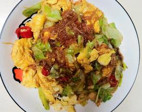 倒入粉丝,鸡蛋,炒匀至食材都熟透