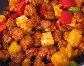 大火煮至粘稠,倒入肉块、菠萝、彩椒,翻炒均匀