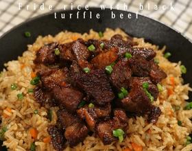 倒入牛肉粒和小葱花翻炒均匀捞出