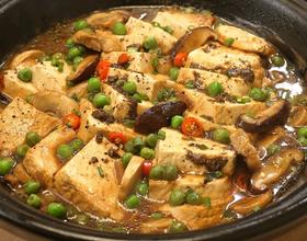- 1. 准备食材:黑松露酱,菌菇复合调味料口蘑,香菇,柴火豆腐,洋葱丝,蒜片,小米辣,甜青豆