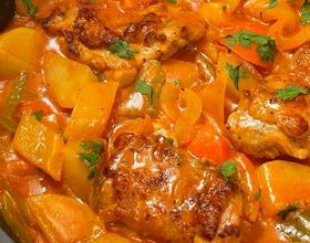 倒入土豆和胡萝卜,加黑胡椒,盐和甜椒粉,在一块咖喱和椰浆。