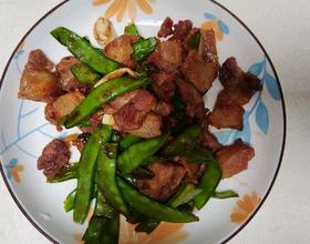 锅热下三层肉,煸炒出油,尽量多煸出些油,多出的又到掉,再下焯过水的荷兰豆