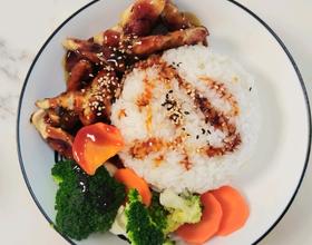 盛饭摆盘,淋照烧汁,撒黑白芝麻