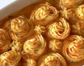 将土豆碾成泥,倒入一勺黑松露酱,适量盐和黑胡椒,搅拌均匀