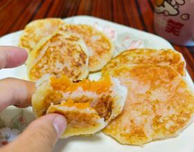 把红薯丸子包入里面,再压成饼状,放入锅中,中小火兼至一面定型再翻面煎