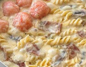 - 6. 倒入培根,口蘑和意面,加入黑松露酱1勺,黑胡椒盐调味。