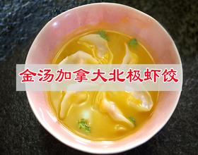 - 9. 将粉碎后煮好的金汤倒入大碗中蒸好的虾饺放入金汤