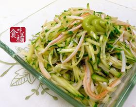 假蟹肉丝成条状,置平盘中强微波1分半热透(倒扣一磁盘防脱水干燥),放凉备用